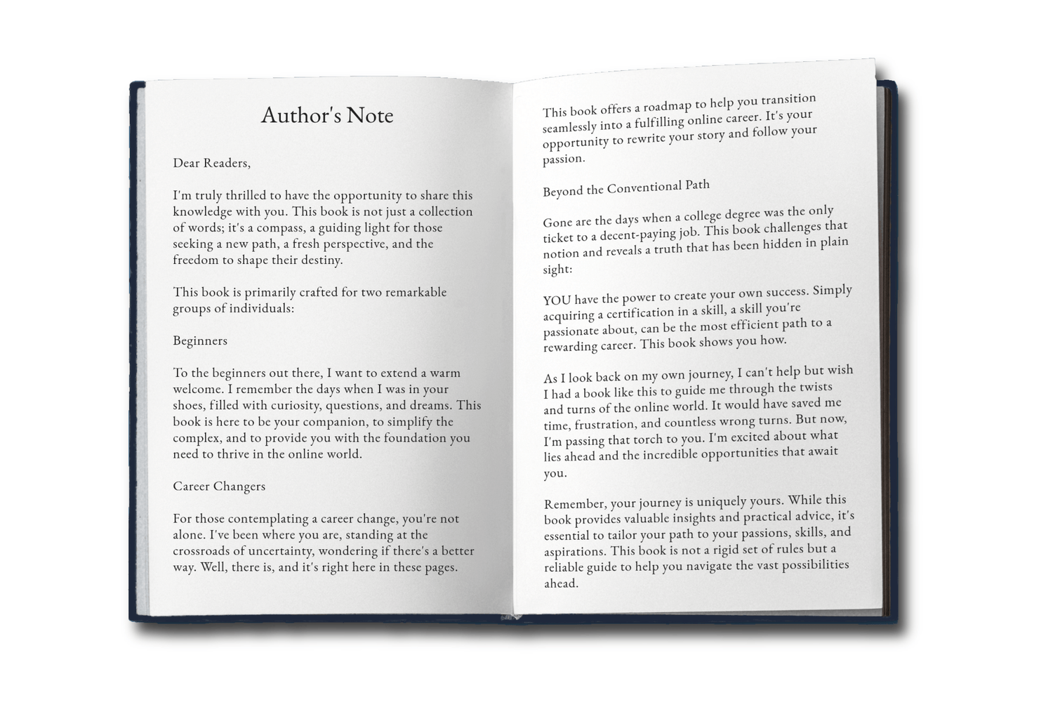 My goal is to help you develop your strategy to starting the career of your dreams, becoming the best you can be in any work from home career, as well as finding your purpose that is fulfilling and that you enjoy. This book is a compass that will help guide you through the process of creating the life you envision your way.